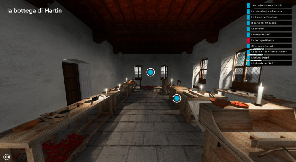 Due ologrammi raccontano il dramma della pesca del corallo, effettuata dai pescatori torresi mediante le barche dedicate, denominate coralline, spesso aggredite dai pirati saraceni, e il momento della nascita della lavorazione del corallo a Torre del Greco, importata all’inizio del 1800 dall’imprenditore francese Bartolomeo Martin, che coinvolse moltissimi operatori, soprattutto donne.
